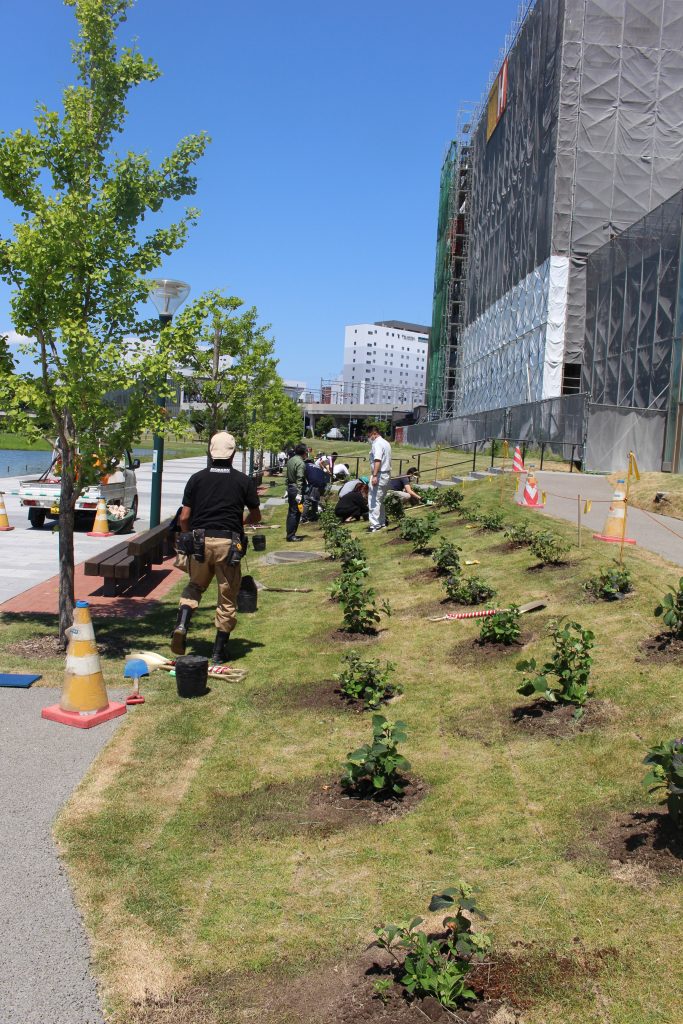 そして今年6月23日、旭川市長・旭川青年会議所シニアクラブメンバー・現役メンバーと共に雲ひとつない青空の下、あさひかわ北彩都ガーデンの地(森山病院裏~スターバックス裏)にアジサイ83株、ノリウツギ54株、合計137株を植えました。今はまだ30㎝くらいの高さですが、3年後には1.5メートルくらいまで成長するそうです。